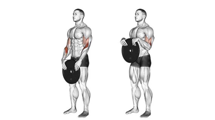 Упражнение за предмишница с диск – хващате диска ( на два без десет ), лактите стоят до тялото и сгъвате и ги сгъвате заедно с китките като повдигате диска на горе. При пускането продължавате да държите мускулите на пред мишницата стегнати.