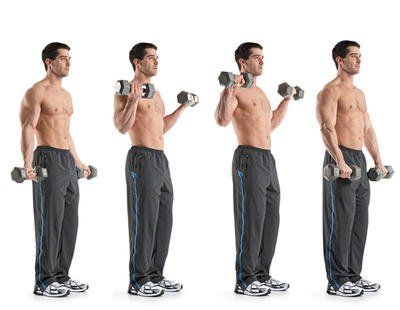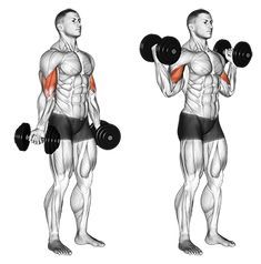 Бицепс с дъмбели – държите лактите завъртени плътно до тялото както е показано на картината, китките завъртяни навън сгъвате до горе и пускате бавно на долу.