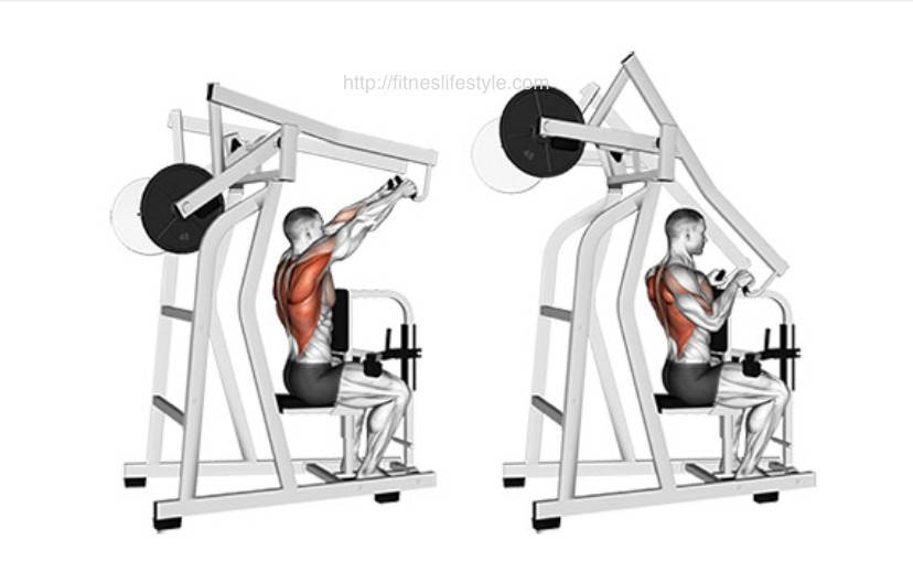 Набиране подхват на машина с помощ за гръб – пускате до долу за да усетите разтягане на гърба, дърпате с гърба като гледате възможно най – малко да натоварвате бицепса (с това разтягане, което усетихте при пускането).