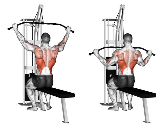 Гръб на горен скрипец с широк хват – хващате лоста широко, изправяте гърба и кръста, пускате хубаво до горе и когато усетите разтягане на гърба, дърпате с гърба (с това разтягане, което усетихте при пускането) в посока долната част на гърдите.