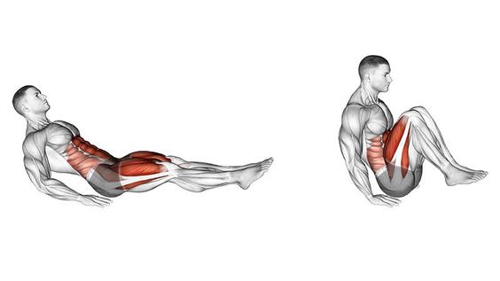 Упражнение за корем – сядате и слагате дланите на земята, държите стегнат корема, изпъвате тялото и краката и връщате в начална позиция.