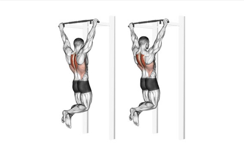 Гръб – набиране с широк хват (ако ви е трудно да се набирате използвайте уред с помощ) – пускате до долу, набирате като гледате движението да е по посока към долната част на гърдите.