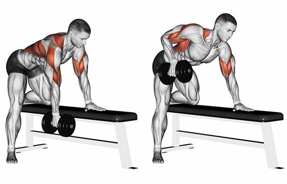 Гребане с един дъмбел за гръб – заставате по показания начин на пейката с прав гръб и кръст, пускате дъмбела до долу, така че да усетите разтягане на гърба и изгребвате с гърба към долната част на корема, като трябва натоварването на бицепса да е възможно най–малко.