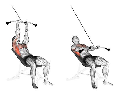 Гръб от скрипец на пейка с прав лост - пускате до горе, като трябва да усетите хубаво разтягане на гърба, лактите леко встрани и дърпате на долу с леко свити, но статични лакти.