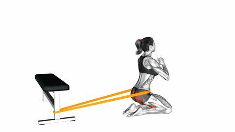 Тип хип тръст с ластик за дупе – връзвате ластика в близост до земята, поставяте го под хълбоците, изнасяте се напред до толкова, че да можете да си направите зададените повторения, прикляквате както е показано на снимката и движението е с изнасяне на дупето напред, като стягате дупето и при връщането назад (и при двете движения дупето трябва да е стегнато).
