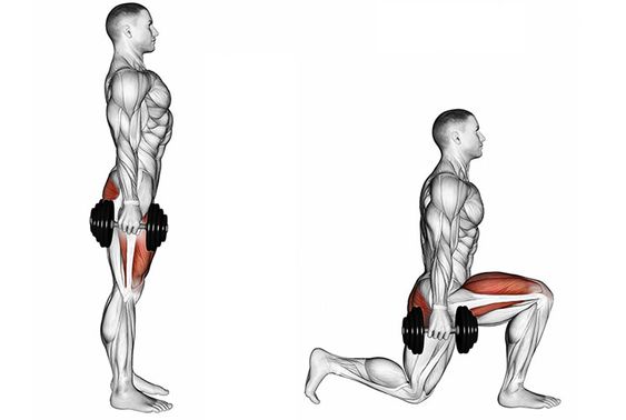 “Напади” напред - разходка - хващате два дъмбела, правите голяма крачка напред, клякате и с двата крака, като трябва коляното да е на 90 градуса при клека.