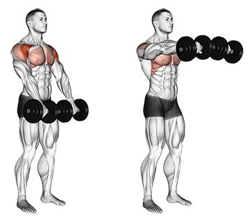 Предно рамо - изпълнявате упражнението с прави лакти. Повдигате дъмбелите напред до нивота на брадичката и пускате бавно пред краката.