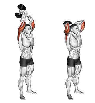 Упражнение за трицепс с дъмбел - лактите сочат тавана, пускате хубаво дъмбела до долу зад врат и разтваряте лактите до край.