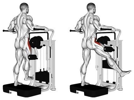 Машина за задно бедро – дръжте ходилата на контрашпиц, сгъвате до прав ъгъл и пускате бавно надолу.